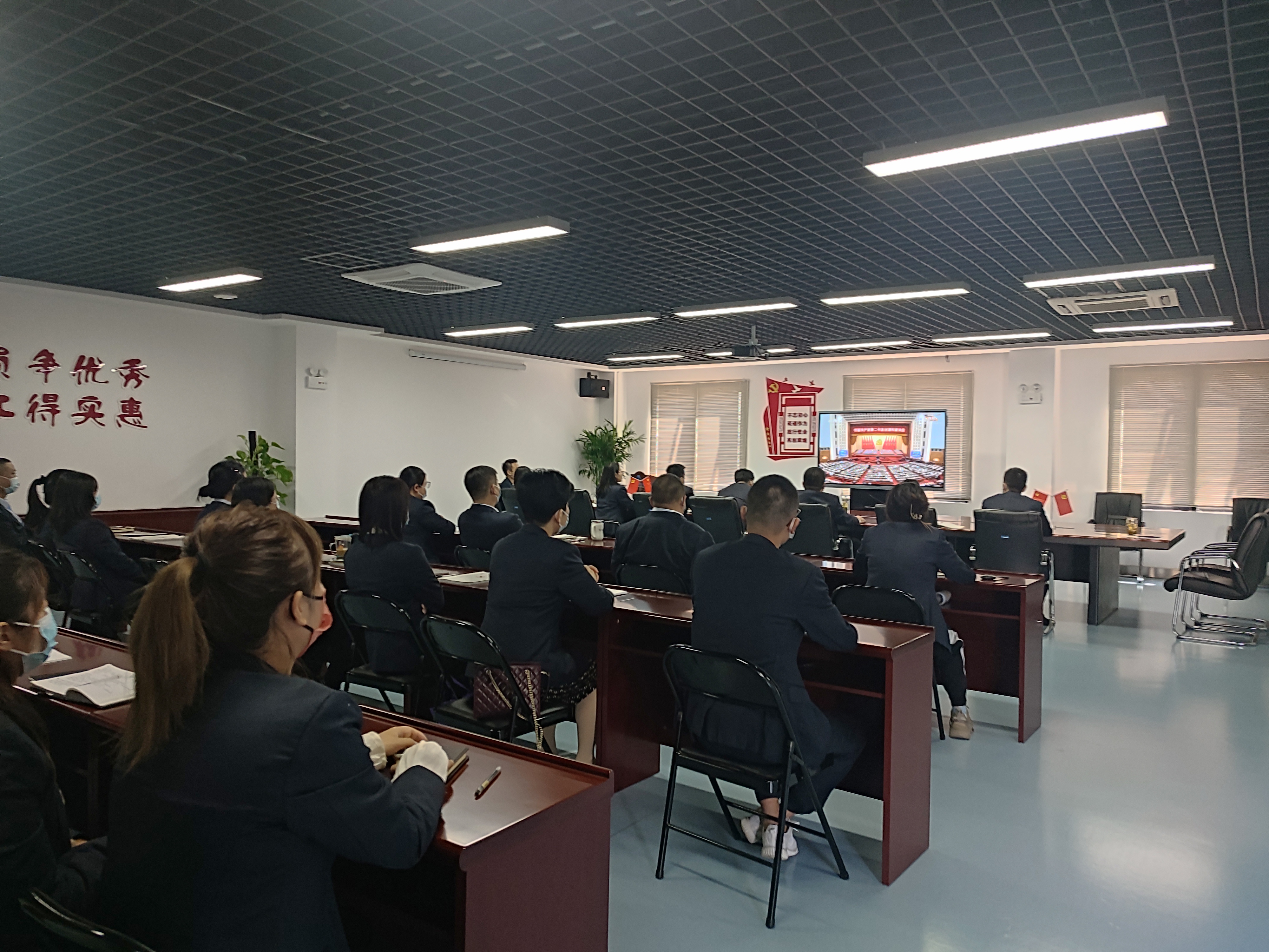 到会党员、入党积极分子全神贯注地观看,认真记录报告重要金句。开幕式结束后大家一致表示,要全面贯彻习近平新时代中国特色社会主义思想,坚决做到“两个维护”,心怀“国之大者”,学深悟透报告提出的重要思想、重要观点,用二十大精神武装头脑、指导实践,将二十大精神融入日常工作中,并持续以良好的精神状态、求真务实的作风,做好公司各项工作。