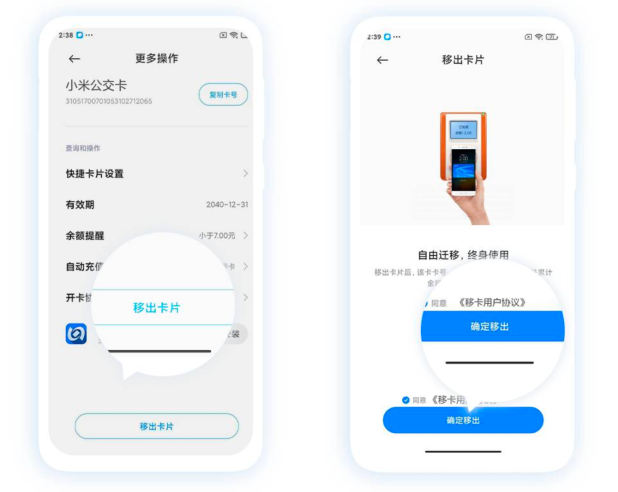 1.移出:打开小米“钱包”APP→选择小米公交:合肥通(交通联合)界面→选择“更多操作”→点击“移出卡片”,确认移出。