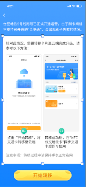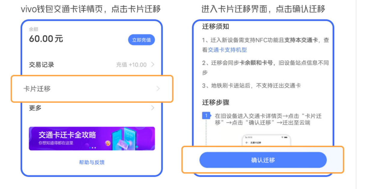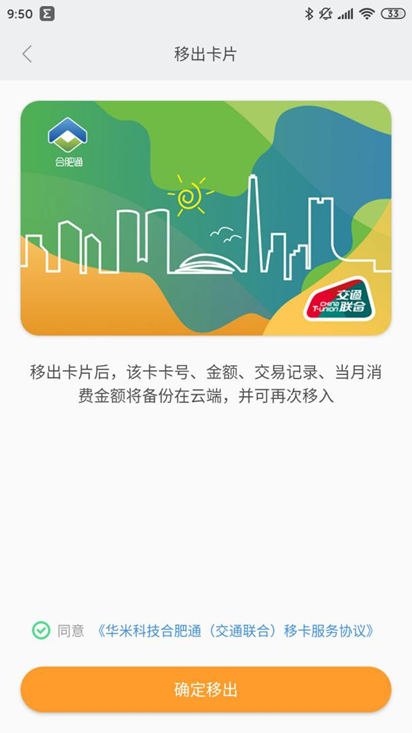 1.移出:在合肥通(交通联合)详情页点击“卡片迁移”→进入“卡片迁移”界面,点击“确认迁移”。