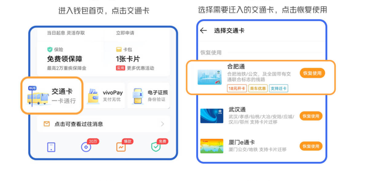 2.移入:钱包首页点击“交通卡”→选择合肥通(交通联合),点击“恢复使用”。