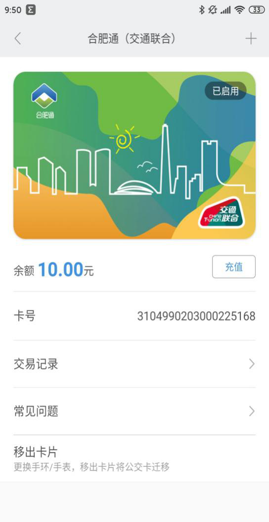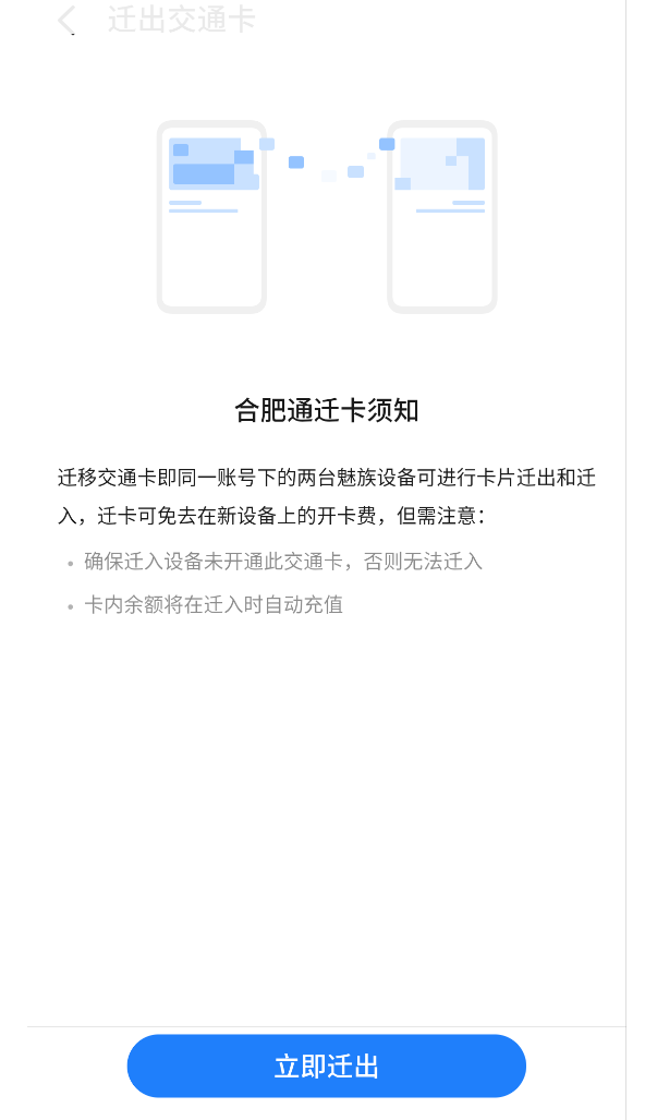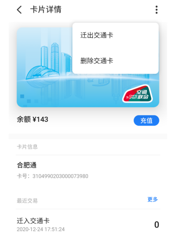 1.移出:打开Meizu Pay,点击首页“交通卡”→ 进入合肥通(交通联合)卡片详情页→点击右上角,选择“迁出交通卡”选项→确认迁出。
