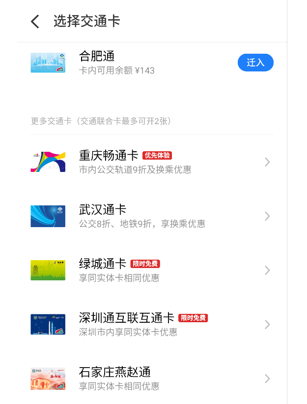 2.移入:打开开卡列表页,选择合肥通(交通联合)→点击“迁入”,确认迁入。