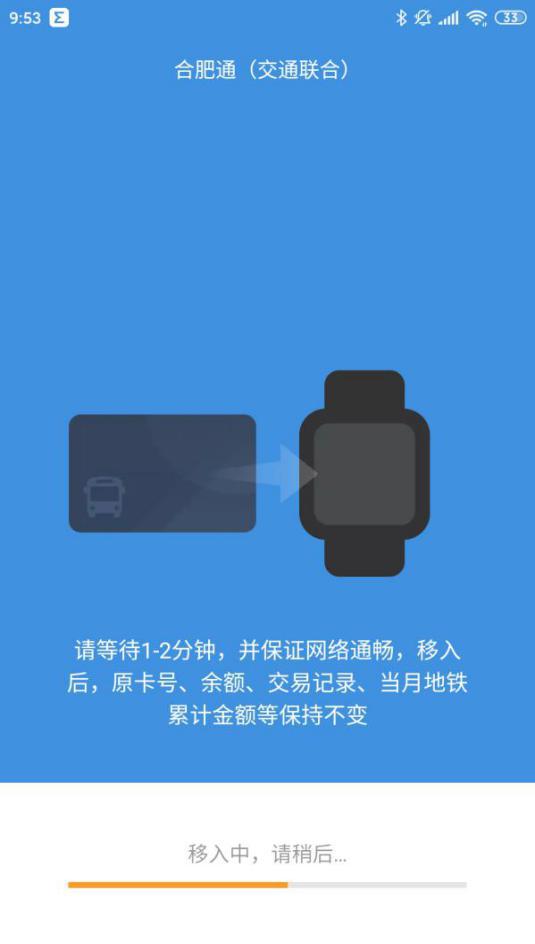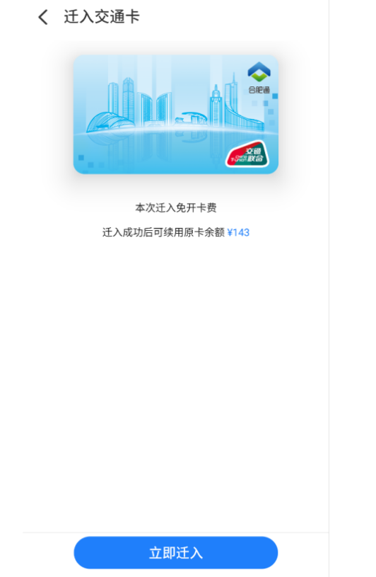 2.移入:返回到卡列表中,可以看到“合肥通(交通联合)”为可移入状态;移出成功后稍等1分钟待云端同步数据完成,然后在此页面选择“立即移入”。