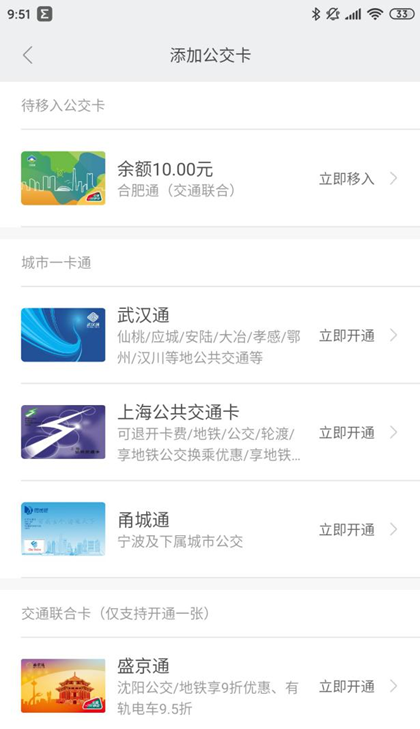 2.移入:打开开卡列表页,选择合肥通(交通联合)→点击“立即移入”,确认移入。