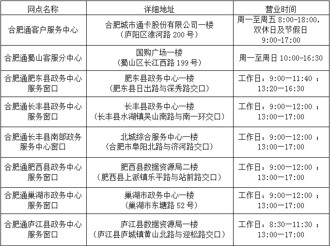 合肥通公司自有服务网点一览表